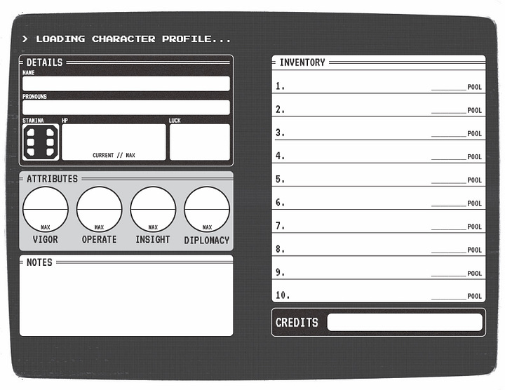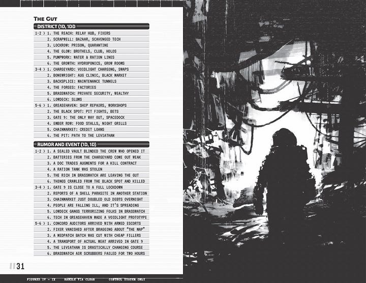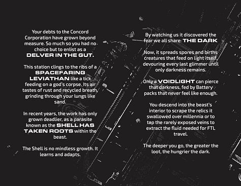 A rules-bright sci-fi horror dungeon crawl where your only safety is a beam of light that shrinks every ten minutes. Descend into a space station bolted to a migrating leviathan then go and explore the void with this complete kit for building your own sci-fi adventures in a dying future.